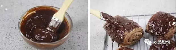 2、将巧克力甘纳许趁热刷在烤好的可颂面包表面,厚厚刷上一层。等冷却后,巧克力甘纳许会凝固。