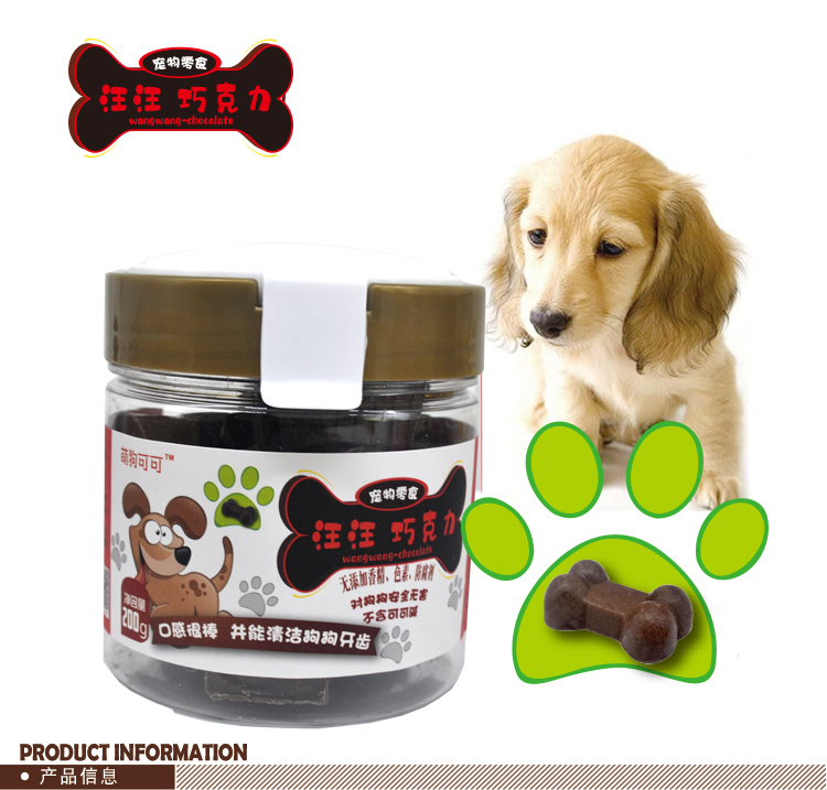 产品分类: 汪汪巧克力产品形态:骨头状产品口味:巧克力风味产品使用:巧克力风味狗狗零食,目前已畅销美国、澳大利亚等国,可定制